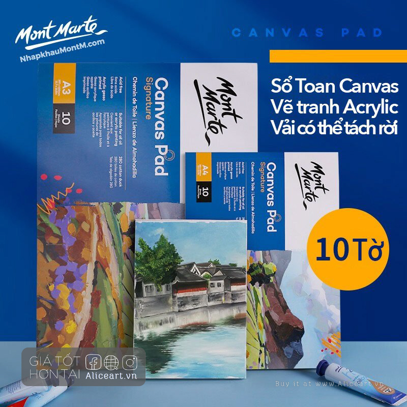 Để vẽ acrylic, sơn dầu. Tập toan gáy keo 10 tờ có thể xe rời ra tiện lợi như những tờ giấy, toan đã được phủ sẵn gesso và sẵn sàng để vẽ. Mont Marte Canvas Pad, độ dày 280Gsm.