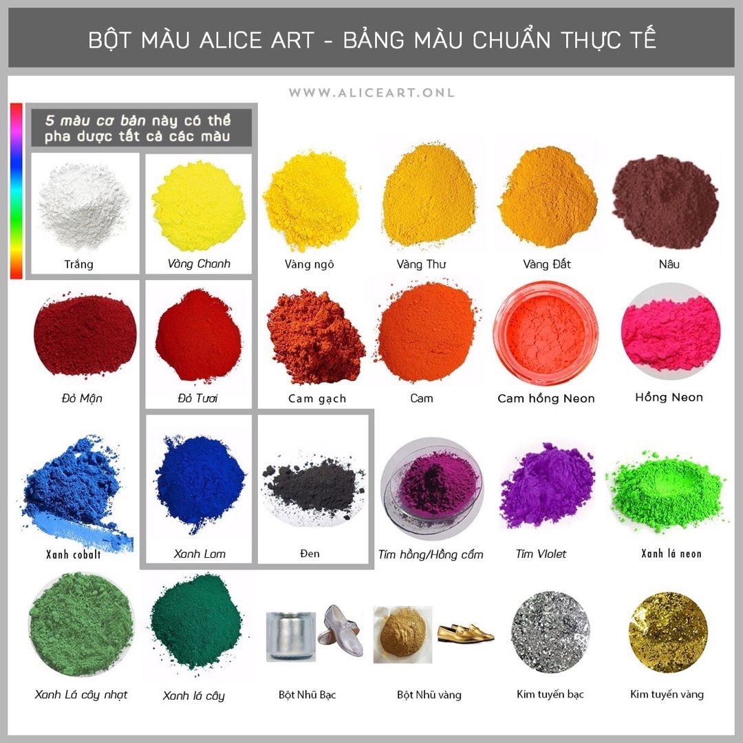 Bột màu Alice có rất nhiều công dụng nghệ thuật: Làm Bột Màu Mỹ Thuật; Bột Nhũ Nail; Pigment làm màu nước, vẽ trang trí màu, làm Slime. Mời các bạn vào xem Chi tiết sản phẩm và hướng dẫn cách sử dụng.