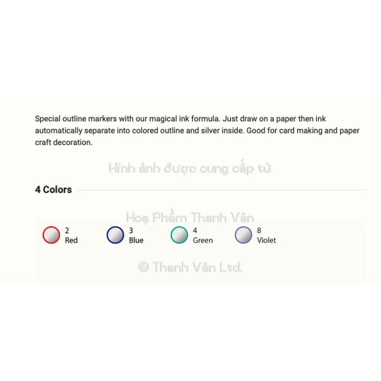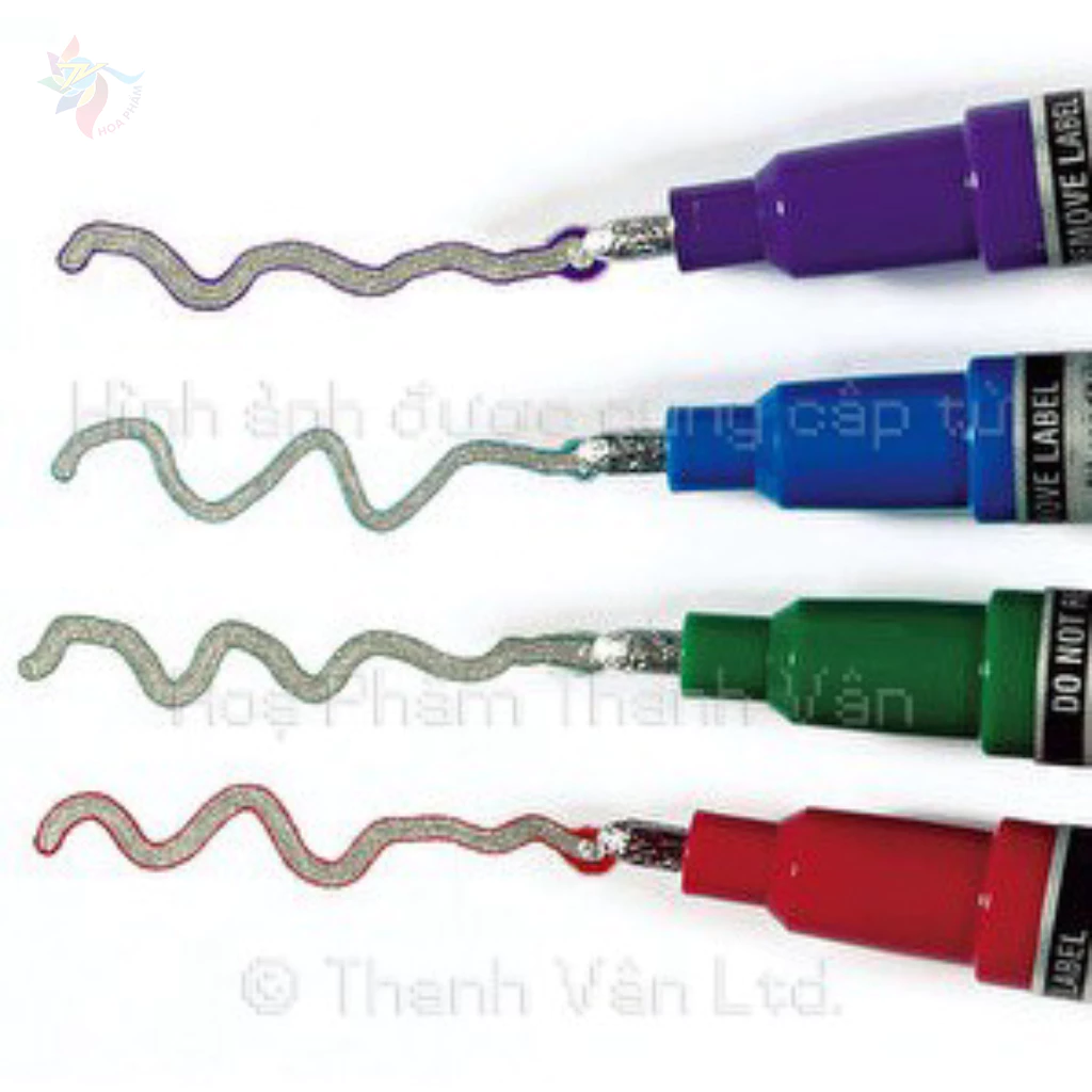 Màu sơn đục không xuyên sáng rất phù hợp để vẽ trang trí lên thủy tinh. Bên trong là mực màu bạc – silver, viền ngoài có 4 màu : xanh dương, xanh lá, đỏ, và tím