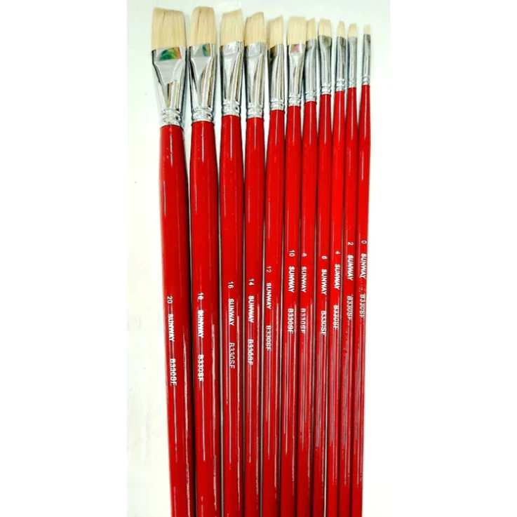 Cọ vẽ lông cứng sơn dầu, acrylic đầu vuông bằng dẹt lông lợn | lông heo | lông thú | cán dài đỏ Sunway nhiều size 0 – 12