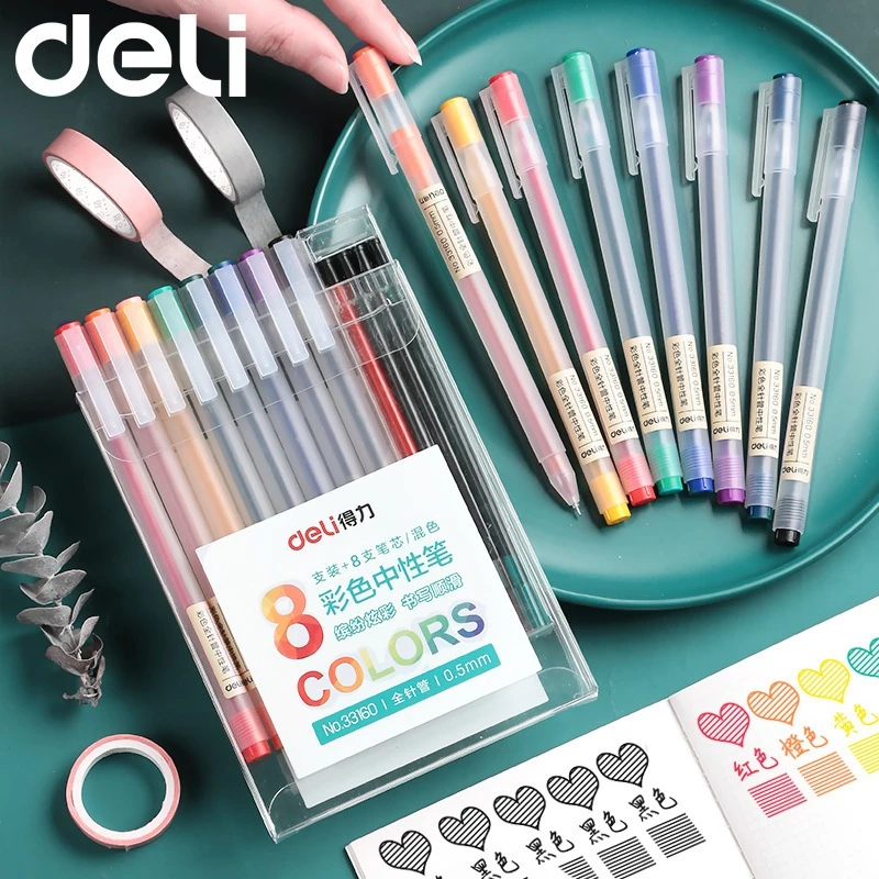 Set 8 Bút bi nước,bút chữ A mực Gel kèm 8 ngòi thay, trơn tru lâu hết mực, nhanh khô 0.5mm Deli chất lượng cao No33160